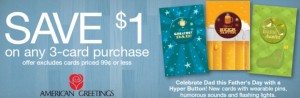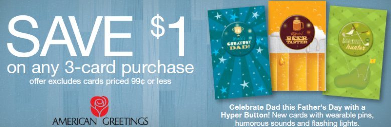 With Father’s Day coming up, this is a great coupon to have on hand. American Greetings has just released a coupon good for $1.00 off the purchase of three cards!
