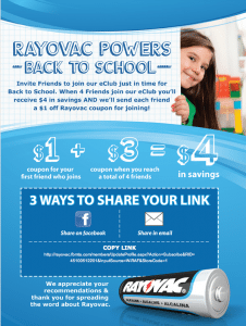 Here is how the promotion works. For the first friend you refer that signs up for their FREE eclub you will receive a coupon valid for $1.00 off Rayovac Products. Then if you have up to 4 friends that sign up for the eclub they will send you $4 in savings.