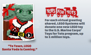 This is a really cool and easy way to donate to those who really need help this Christmas. LEGO is offering to give one toy to the Toys For Tots Program when you send a Star Wars LEGO eCard to one of your friends. They have promised to give up to 1 Million toys. So, PLEASE make sure you forward this giving freebie to everyone you know!