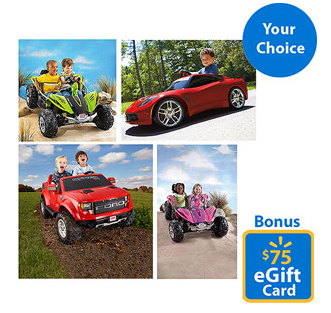 Right now at Walmart.com, purchase select Ride-Ons and you will receive up to a $75 Walmart eGift Card with your purchase!
