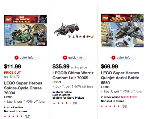 Target is having a Buy 1, Get 1 40% Off Sale on select toys on their site! Looking through the sale participating toys brands include Littlest Pet Shop, Monster High, Disney, LEGO, Nerf and more!