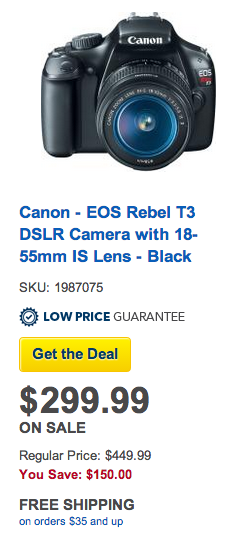 Or, there is the Canon EOS Rebel T3 DSLR Camera with 18-55mm IS Lens in black for only $299.99! (Reg. $449.99)