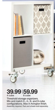 **This week at Target, there is also an in-ad Coupon for $5 off a Storage or Organization Purchase of $25 or more. You can also get this coupon sent to your mobile device by texting STORAGE to 827438. This coupon EXCLUDES cleaning supplies. Below are just a couple ways I saw to use the coupon with in-ad deals. There will obviously be a lot more ways to use it once you get in store.