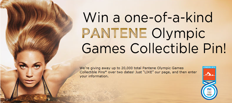 Panteen is giving away 10,000 Olypmic collectible pins today at 8:00pm ET. Head over to the Pantene Facebook page, and “like” them. Once you like them, you will be directed to a page informing you that all the pins are gone. That is true, you will not be able to complete the form required to win a pin until the giveaway begins at 8:00pm ET.