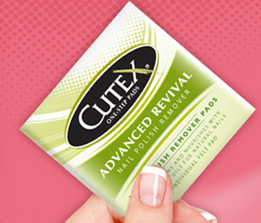 Head over to the Cutex Facebook page, “like” them, and you will be eligible to receive a new Cutex Advanced Revival Nail Polish Remover Pad.