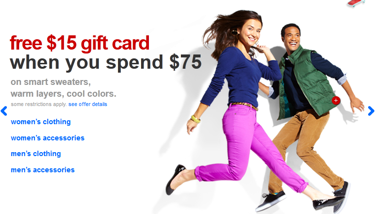 Target is offering a $15 gift card with any $75 clothing purchase! This could be a great way to snag some new fall fashions or cross of some Christmas shopping.