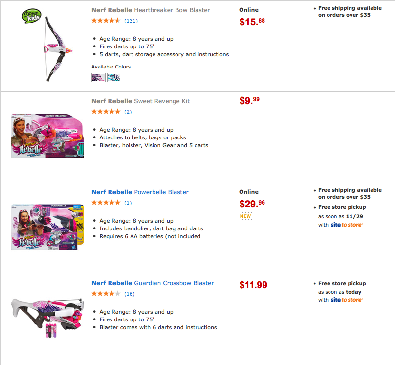 Right now at Walmart.com you can score some pretty awesome deals on Nerf Rebelle Toys! Looking through the sale, most of the items are marked up to 50% off…but Walmart isn’t showing the regular price, just the sale price! So you may now realize how awesome each deal is!