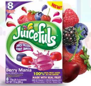 Head over to the Juicefuls Facebook page, “like” them, and you can print a coupon for $1.00 off one box. Juicefuls are a new fruit snack from Welch’s. They are made with 100% real fruit and are filled with 100% real fruit juice.