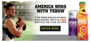 FRS Healthy Energy is running a promotion & the first 100,000 people who sign up will receive a FREE can or bottle of FRS Healthy Energy Drink IF the Denver Broncos win this Saturday, January 14th!