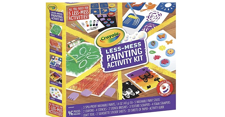 Amazon has this Crayola Less Mess Painting Activity Kit (46pcs) for only $12 Shipped! This has really great Reviews. This 46 count Crayola Art Set for Kids includes 5 Washable Paint Sticks, 3 Spill Proof Paints, 1 Black and 1 White Crayon, 2 Stencil Brushes, 4 Foam Stampers, 3 Foam Texture Scrapers, 4 Stencils, 2 Silhouette Sticker Sheets, Scraper Tool, 20 Sheets of Paper & Instruction Idea Guide.